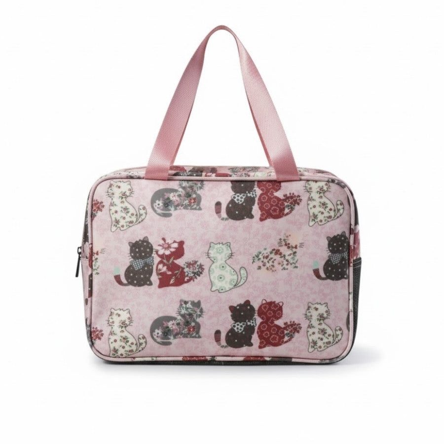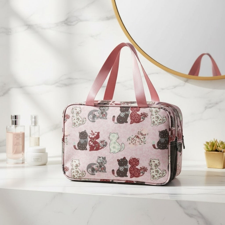 Avec ses imprimés de chats ludiques sur fond rose, le Vanity Chat – Format Voyage à Double Compartiments apporte une touche de légèreté à vos voyages. Sa robustesse et sa résistance aux éclaboussures en font un choix fiables pour protéger vos produits de beauté lors de vos déplacements, peu importe la météo.