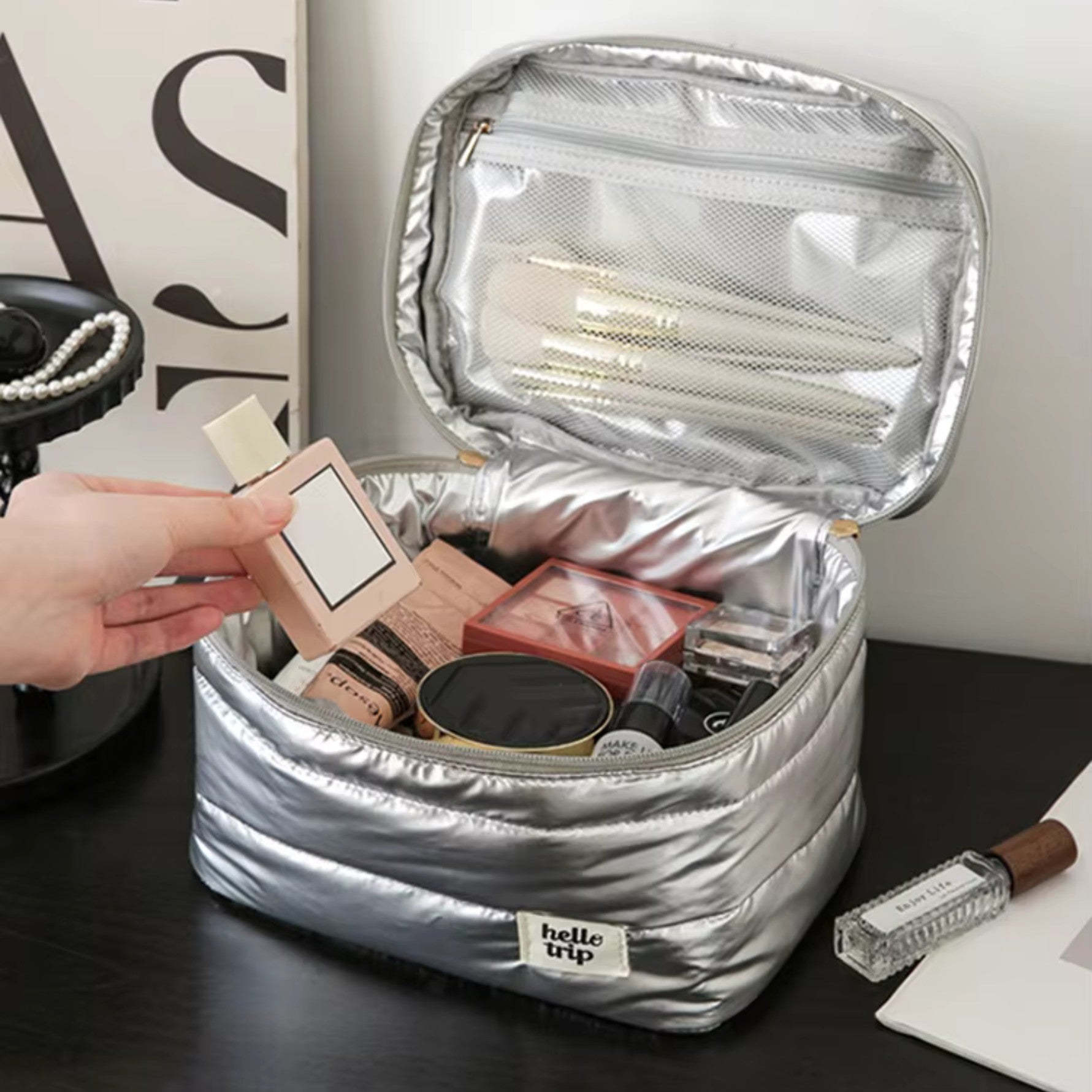 Au-delà de son utilisation en déplacement, le Vanity matelassé – Puffer est un allié précieux dans votre routine quotidienne. Il garde votre espace de bain rangé et ordonné grâce à ses compartiments bien pensés, vous offrant un accès facile à vos produits de beauté favoris.
